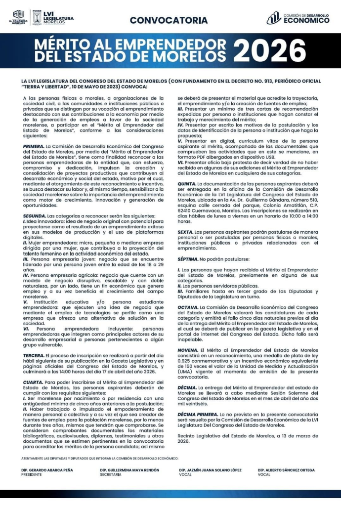 El Mérito al Emprendedor 2026 es un reconocimiento del Congreso del Estado de Morelos dirigido a personas, organizaciones e instituciones que impulsan proyectos productivos y generan empleo en la entidad.